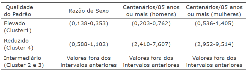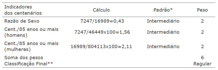 Neste estudo, para construir a proposta de classificação da qualidade dos dados populacionais dos centenários, utilizou-se como ferramenta de classificação os três primeiros indicadores apresentados na Tabela 1.