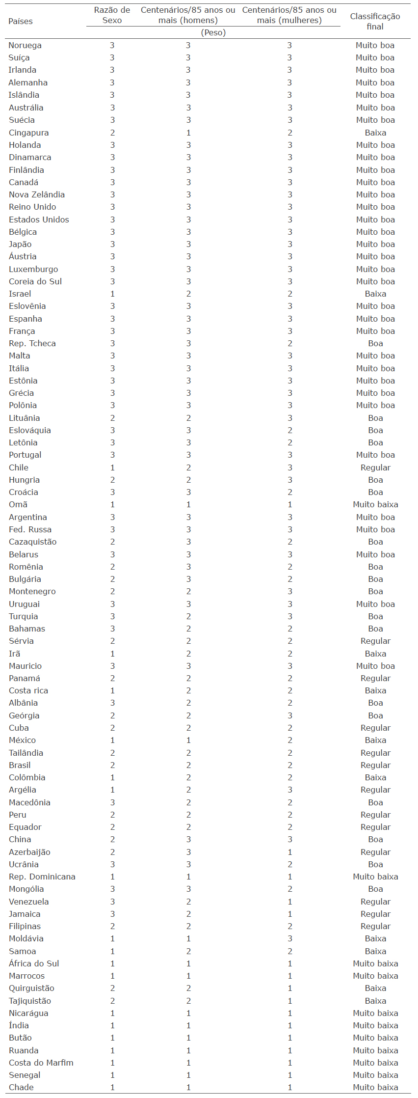 De acordo com os intervalos de referência como padrão de avaliação da qualidade mostrados na Tabela 3 e com a definição dos pesos do Quadro 1 a classificação final da qualidade dos dados censitários dos idosos centenários, para os 85 países selecionados são mostrados na Tabela 5.