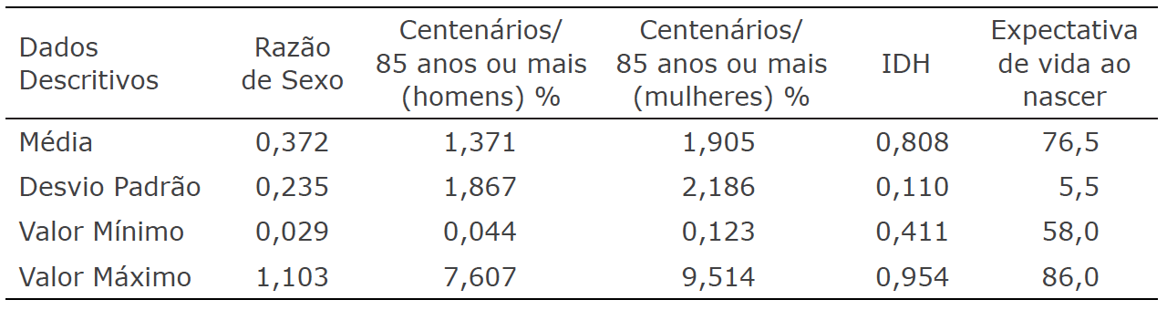 Os resultados da análise descritiva dos dados referentes aos indicadores dos centenários para os 85 países incluídos nesta pesquisa, de acordo com os critérios estabelecidos, o IDH e a expectativa de vida ao nascer, segundo a UNDP (2018), estão apresentados na Tabela 1.