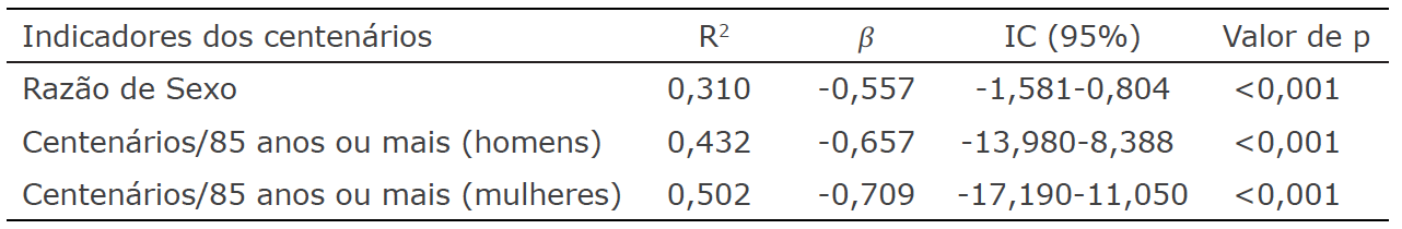Fonte: Elaboração própria.Na Tabela 2 é possível observar que houve uma correlação significativa entre o IDH e os três indicadores selecionados para a proposta de classificação: razão de sexo (R2 = 0,310; p < 0,001); razão da população com 100 anos ou mais com relação aos idosos com 85 anos ou mais de idade: homens (R2 = 0,432; p< 0,001); e mulheres (R2 = 0,502; p < 0,001). Portanto, quanto mais elevado for o IDH, menores foram os valores dos indicadores selecionados, conforme sinaliza o parâmetro β. Relações estas, também foram descritas em outros estudos (Chuanwan, Prasartkul, Chamratrithirong, Vapattanawong & Hirschman, 2012; Reis & Turra, 2016; Terblanche & Wilson, 2015).