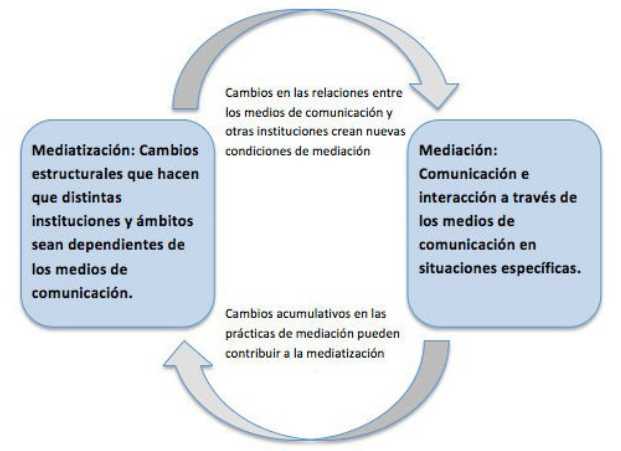 Con el fin de comprender la perspectiva particular que la teoría de la mediatización aplica a la influencia social y cultural que tienen los medios de comunicación (Hjarvard, 2013;Krotz, 2009), es importante distinguir entre los conceptos de ‘mediación’ y ‘mediatización’. Por ‘mediación’ entendemos el empleo de medios para comunicarse e interactuar; por ejemplo, un político puede elegir mediar su comunicación a través de una rueda de prensa o de un tuit. La elección del canal de mediación condiciona directamente la forma y el contenido del mensaje, así como quién tiene la opción de participar en el acto de comunicación. Sin embargo, la manera en que está mediado el mensaje político individual no influye en el método de funcionamiento de la institución política ni en la relación de la política con los medios de comunicación, la cultura y la sociedad en general. Por el contrario, la mediatización de la política atañe a los cambios estructurales que se producen a largo plazo en la relación entre la política y los medios de comunicación, a través de los cuales se reconfiguran las relaciones entre las instituciones implicadas y se crean nuevas condiciones para la comunicación y la interacción. La mediación pertenece a la esfera de los actos comunicativos, mientras que la mediatización se refiere a los cambios estructurales entre diferentes ámbitos culturales y sociales.