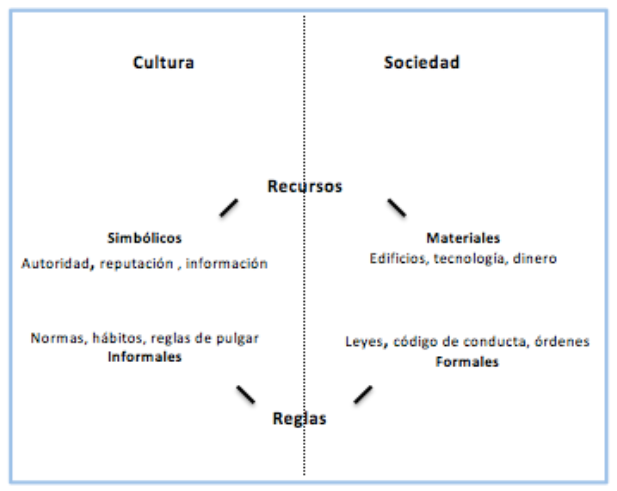 Institucional: modos de funcionamiento típicos como resultado de la legislación, la estructura organizativa, la financiación, la experiencia histórica, la reputación, etc.