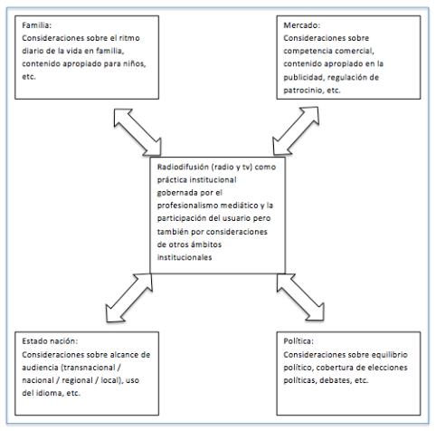 Cabe también destacar que el funcionamiento de los medios de comunicación se ve igualmente influido por otras instituciones, es decir, la forma en que funcionan los medios no está solamente determinada por una lógica mediática ‘pura’. Del mismo modo en que los medios, al integrase en la política y la vida familiar, han marcado estas instituciones, otras instituciones dejan también su impronta en los medios. Si nos fijamos, por ejemplo, en la evolución de los medios de radiodifusión (radio y televisión), estos siempre han tenido en cuenta otras instituciones culturales y sociales, como la familia, la política, la nación y el mercado. Así, los programas infantiles se adaptan a las necesidades específicas de este público objetivo;las reglas democráticas de la política condicionan la cobertura radiotelevisiva de las campañas electorales; y el uso de la publicidad se regula de varias formas, para velar por los intereses de los consumidores y, al mismo tiempo, garantizar la igualdad de condiciones para todos los anunciantes. Asimismo, la radio y la televisión tienen que adaptarse a un marco nacional, por ejemplo, en lo relativo al idioma. El gráfico 3 ejemplifica esta interdependencia mutua entre los medios de comunicación y otras instituciones en un sistema interinstitucional (Thornton et al., 2012) para el caso de la radio y la televisión. Como explicaremos más adelante, los avances de las últimas décadas han hecho que los medios de comunicación sean más dependientes del mercado, pero por otro lado han logrado una mayor autonomía en relación con otras instituciones. Por tanto, el funcionamiento de la radio y la televisión no sólo se ha regido por las consideraciones profesionales propias de los medios (técnicas y organizativas) o por el interés de los usuarios, sino también por las exigencias impuestas desde otras instituciones. Esto se hace extensivo a otros medios, no es exclusivo de la radio y la televisión.