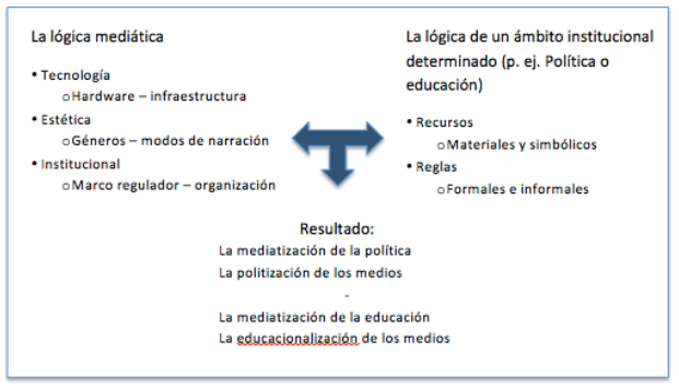 En este contexto, la mediatización puede describirse como un proceso creado por la superposición y adaptación recíproca de las lógicas de los medios de comunicación y las de otras instituciones, como se ilustra en el gráfico 4. Tal y como se representa en éste, el resultado de esta confluencia no se limita necesariamente a la mediatización de la institución implicada, sino que la transformación también se produce a la inversa. Por ejemplo, cuando los medios de comunicación se integran en la vida política, reciben en cierto grado la influencia de la lógica política, por lo que es legítimo hablar también de una politización de los medios. Puede parecer que los distintos servicios informativos controlados por partidos políticos y grupos de interés se rigen por principios periodísticos, cuando en realidad actúan en gran medida según motivaciones políticas. De un modo similar, la integración de los medios de comunicación en el sistema educativo contiene elementos tanto de mediatización de la educación como de ‘educacionalización’ de los medios, es decir, que los medios se adaptan para servir a propósitos educativos. Ambos procesos pueden ocurrir simultáneamente. El empleo de videojuegos con fines educativos (p.ej. el juego danés Conflictos Globales: Palestina, en el que se aprende sobre los conflictos a través del juego) implica tanto una ‘ludificación’ de la educación, mediante el uso de la dramaturgia de los videojuegos como factor motivador, como una instrumentalización pedagógica y didáctica del género del videojuego.