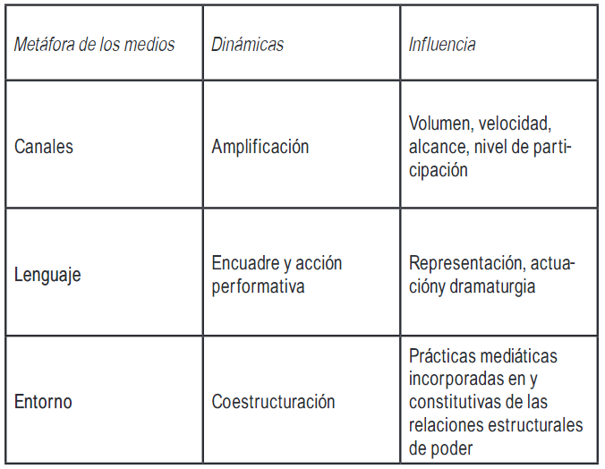 Sin embargo, a través de los distintos contextos podemos identificar dinámicas generales que caracterizan la comunicación mediada en una sociedad mediatizada. Las partes implicadas pueden beneficiarse de ellas y, a la vez, tienen más o menos la obligación de respetarlas al utilizar los medios. Estas dinámicas son particularmente evidentes cuando el objetivo es influir en la opinión pública en situaciones de conflicto, aunque están igualmente presentes en circunstancias normales, sólo que de un modo menos visible. En las situaciones de conflicto, en las que generalmente existe una lucha de poder, se puede ver con especial claridad cómo las diferentes partes intentan utilizar los medios de comunicación en su propio beneficio, mientras que sus actos están a la vez condicionados en cierta medida por los medios. Para ilustrar esto recurriremos a las tres metáforas propuestas por Meyrowitz (1993), cada una de las cuales descubre un aspecto de lo que son y hacen los medios de comunicación: los medios como canales, como lenguaje y como entornos. Basándose en estas distintas metáforas, Hjarvard, Mortensen y Eskjær (2015) establecen una tipología de las dinámicas mediáticas que generalmente representan las condiciones de comunicación e interacción en una sociedad mediatizada: amplificación, encuadre y acción performativa y coestructuración(véase la tabla 1).