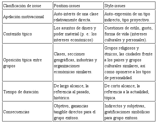 Por otra parte reconoce que el position-issue, propuesto por Paul Lazarfeld y su equipo, “implican la promoción de las acciones del gobierno a partir de un conjunto de alternativas, sobre las que se define la distribución de las preferencias electorales” (Stokes: 1963: 373). La definición de position-issue, para el autor, enfatiza aquellos temas que generan dos posiciones o más.