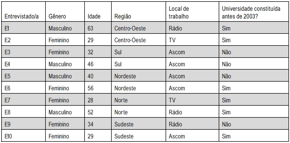 Dessa forma, seis entrevistadas7 são mulheres e quatro, homens. Seis jornalistas escolhidos têm até 40 anos de idade, três estão na faixa de 41 a 60 anos e um está acima de 60 anos. Na seleção por distribuição geográfica, foram escolhidos dois jornalistas de cada região do Brasil, a fim de ter números iguais de participantes de cada região geográfica, e que trabalham em áreas diversas da Comunicação8. Nesse universo, há ainda seis jornalistas que atuam em instituições formadas antes de 2003 e outros quatro em universidades constituídas após 20039. Essa proporcionalidade seguiu o critério da quantidade de instituições formadas antes e depois de 2003. Até 2003, de acordo com dados do Programa de Apoio a Planos de Reestruturação e Expansão das Universidades Federais (Reuni), eram 45 universidades públicas federais em todo Brasil. Entre 2003 e 2018, foram acrescentadas 17. Os critérios estão resumidos no quadro abaixo (Ver Quadro 1):