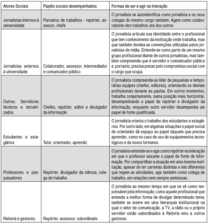 No quadro (Ver Quadro 2), é possível observar um retrato panorâmico do que foi apresentado acima e tem relação direta com as perguntas desta pesquisa: os atores sociais com quem os jornalistas interagem no cotidiano das práticas na universidade, os papéis sociais mobilizados durante as situações de interação e a as formas de ser e agir dos jornalistas nessas situações de interação.