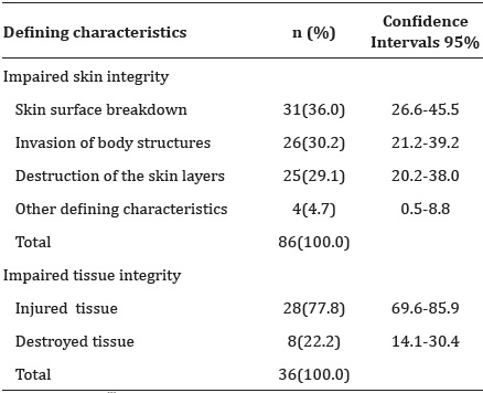 Regarding the impaired tissue integrity of the 48 occurrences, 15 (31.2%) were related to the altered circulation and characterized by damaged tissue; 9 (18.7%) were related to mechanical factors and characterized by damaged tissue; And 24 (50.0%) to other related factors and other defining characteristics.
