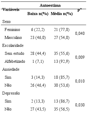 Não foram constatadas associações da autoestima com a presença de um companheiro (p=0,497), comorbidades (p=0,393), interferência nas atividades de vida diária (p=0,319) e personalidade (p=0,130).