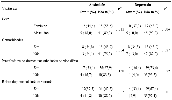 Não se constataram associações significativas entre os sintomas ansiosos e depressivos com as variáveis: escolaridade (p=0,148; p=0,342), presença de companheiro (p=0,301; p=0,361), exercício de atividades profissionais (p=0,160; p=0,347), tempo as doença (p=0,511; p=0,815), hábito de tabagismo (p=0,709; p=0,683) e consumo de bebida alcóolica (p=0,875; p=0,177). Presença de comorbidades e interferência da doença nas atividades de vida diária não foram associadas estatisticamente com os sintomas ansiosos.