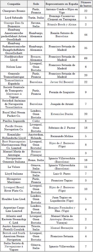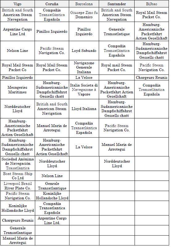 Por lo que refería a la información relativa a los puertos españoles habilitados para la salida de emigrantes, los autores de la Cartilla señalaron los siguientes: Alicante, Almería, Barcelona, Bilbao, Cádiz, Coruña, Las Palmas (Gran Canaria), Málaga, Palma de Mallorca, Santa Cruz de Tenerife, Santa Cruz de la Palma, Santander, Valencia, Vigo y Villagarcía. Es decir, puertos en todos los litorales de la Península, así como en sus posesiones insulares inmediatas29. Para la realización del viaje transatlántico, Rísquez y Ordóñez sugerían los servicios de las siguientes compañías, como se especifica en el cuadro 2: