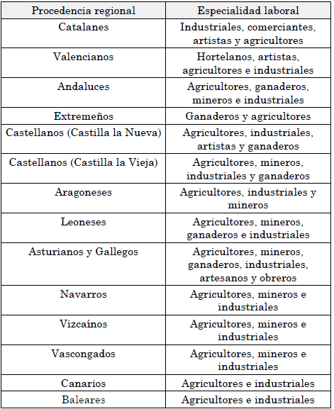 De acuerdo con el cuadro anterior, se advierte que, conforme al criterio e información con la que dispusieron los autores de la Cartilla como fueron las estadísticas publicadas por el Instituto Geográfico y Estadístico, los españoles de las catorce regiones de origen eran individuos ligados a los sectores primario y terciario de la economía, con la salvedad de los catalanes, que además tenían como característica su participación en el ámbito mercantil; cifras que revelan que entre los emigrantes la mayoría eran hombres dedicados a actividades del sector primario, sobre todo a la agricultura36. Sin lugar a duda que para 1910, las referencias de la presencia de los españoles en los países en que se habían instalado del otro lado del Atlántico, -en la que una minoría destacaba en los más variados rubros económicos-, había observado un giro en la formación ocupacional y adiestramiento cotidiano, pues era bien sabido el peso que tenían en el ámbito mercantil en todos sus rubros, que era un elemento distintivo del colectivo en general.