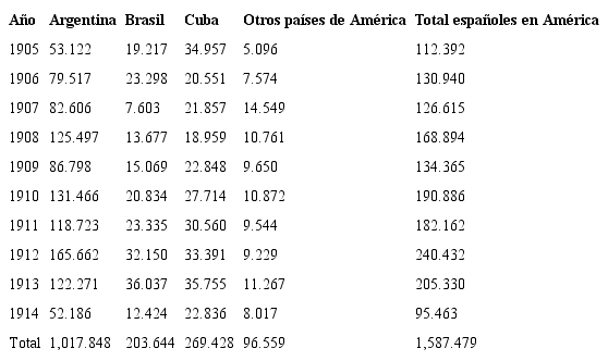 La magnitud que alcanzó la movilización migratoria española en América Latina, en buena medida incentivada tanto por factores internos como externos, se puede constatar en las cifras de la estadística anual de salidas que se registraron en España entre 1885 y 1904, cuyos principales destinos eran Argentina, Brasil, Cuba y en menor escala varios países del continente, que en conjunto sumaron 977,542 individuos12. César Yánez Gallardo puntualizó que a la par con la migración a Cuba, que se vio reducida a raíz de la Guerra de Independencia (1895-1898), se perfilaron nuevos flujos que condujeron a los peninsulares a América del Sur, en particular a Argentina, Brasil y Uruguay. Respecto al periodo 1905-1914, se puede decir que esta etapa fue dominada nuevamente por la emigración a Argentina, a la vez que habría que señalar la importancia que tuvieron las salidas a Brasil y Cuba, como se puede apreciar en el cuadro 1, que destaca de igual manera el lapso 1907-1914 como el de mayor migración de españoles hacia América, que fue del orden de 1,344.147 individuos, en su mayoría hombres jóvenes13.