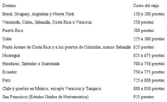 La información que ofrecía la Cartilla del emigrante, se complementaba con los costos que los potenciales viajeros pagarían al adquirir su pasaje de tercera clase en la Transatlántica Española, de acuerdo con el siguiente cuadro.