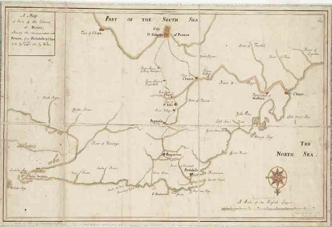 Al respecto, existe una relación fundamental para el entendimiento tanto de la importancia de esta ruta comercial durante el periodo de la colonia en esta zona geográfica, como del análisis de las alianzas militares que tuvieron ingleses y franceses con indios y negros, ya que como lo señala Castillero en su texto, y como una explicación relevante para la historiografía sobre este tema, hubo dos tipos de ruta transístimicas. Por una parte y como ya se ha señalado, el Chagres era «una ruta mixta» con un tramo terrestre desde Panamá a Cruces «que solía hacerse a lomo de mula en ocho horas; otro el más largo y demorado, por el río, hasta salir al mar por la boca del Chagres, continuando el resto del trayecto por la costa hasta Portobelo, todo lo cual demoraba entre 14 y 16 días. Era, pues, una ruta fluvial, marítima y terrestre»35. Por otra parte, estaba la ruta terrestre entre Panamá y Portobelo, «un trayecto de solo 18 leguas pero muy accidentado, salpicado de montes elevados y cruzado por ríos torrentosos, que se hacía a lomo de mula en no menos de cuatro días». Sin embargo, por esta ruta se enviaban los grandes tesoros ya que no existían los riesgos de naufragio como por el río Chagres, y como señala el autor, era mucho más rápido que por la ruta fluvial. El siguiente mapa de la colección Norman B. Leventhal da cuenta de las rutas, ríos y ciudades a las que hace alusión Castillero en su descripción.