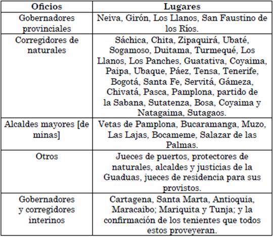 A pesar de las formalidades y de los mecanismos establecidos, algunos rasgos de la provisión llegaron a variar en buen grado. Se trató del modo de provisión de algunos corregimientos, ya que a finales del siglo XVII el rey se avocó su nombramiento como lo hizo también con Nueva España y Perú45. En el Nuevo Reino de Granada, el rey tomó para su provisión los corregimientos de Sáchica, Chita Zipaquirá, Ubaté, Sogamoso, Guatavita, Coyaima, Los Llanos y Los Panches; sin embargo, esto no fue constante ni uniforme pues esto ocurrió solo en ocasiones. Hemos podido hallar 31 títulos entre 1687 y 1732. Se proveyeron nueve cargos distintos en 28 individuos. La mayoría se hicieron por decreto directo del rey (17 casos), tan solo tres se hicieron por consulta del Consejo de Cámara y de los demás no se consignó esta información. En pocas ocasiones los nombramientos se hicieron cuando el cargo estaba vaco, ya que la gran mayoría se hizo por futura. Cabe destacar que en dos ocasiones se concedieron los cargos temporalmente mientras el favorecido pasaba a ocupar el cargo principal que le había sido provisto.