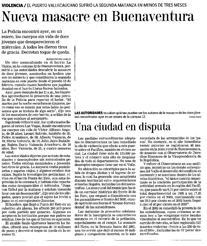 «Nueva masacra en Buenaventura.» El Tiempo, Bogotá 22 de abril de 2005.