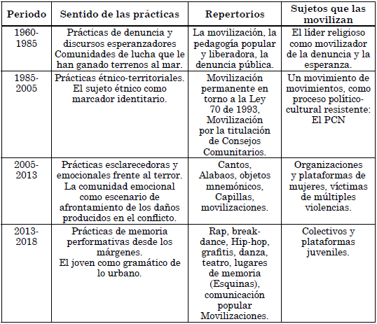 En Colombia las prácticas de memoria tienen, entre otros protagonistas, a plataformas organizativas y colectivos sociales que, como en el caso de Buenaventura, buscan defender la vida e imaginar el futuro en contextos urbanos y rurales violentados3. En este artículo asumimos que los repertorios movilizados para esto no son tan novedosos, ni recientes y tienen una sedimentación histórica. Para explicarlo sugerimos ubicar ciertos hitos y prácticas de memoria en esta ciudad, entre 1960 y 2018, atendiendo a unos cortes temporales4.