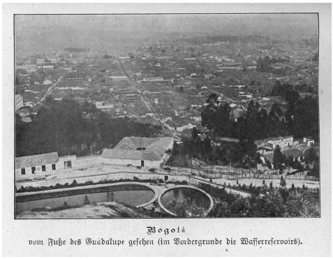 En el capítulo «Imágenes de una capital sudamericana», Beisswanger describe sus primeros días en Bogotá y el ambiente inmediatamente anterior al comienzo de los festejos. Así, comenta que él y su compañero planeaban quedarse dos semanas en Bogotá para presenciar el evento y para dedicarse «con ocio a estudiar la ciudad y sus habitantes»48. Entre las primeras impresiones registradas por el viajero se encuentran descripciones de las numerosas estatuas de próceres, como la de Bolívar, de quien ya había visto varias representaciones durante su viaje por el valle del río Magdalena49. Después de una visita al consulado del Imperio alemán, donde le explicaron que el aparato estatal colombiano se encontraba completamente paralizado debido a las elecciones presidenciales del 15 de julio, visitó los lugares emblemáticos de la ciudad, habló con extranjeros y locales sobre la situación política y económica del país y también subió al cerro de Guadalupe, desde donde tomó algunas fotografías panorámicas (imagen 1); sin embargo, el incidente que más lo impresionó y que describe bien el ambiente tensionado previo a la inauguración de las fiestas, fue el «boicot del tranvía».