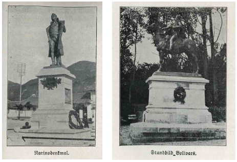 Otro monumento muestra a Simón Bolívar montado en caballo. Su postura es tiesa y poco natural. Con esto, Bogotá ya tiene dos estatuas de Bolívar; en realidad, tres, porque a pocos pasos del monumento recién inaugurado, en medio del Parque del Centenario, se encuentra un templete bonito cuyo techo se eleva sobre un pedestal vacío. La estatua faltante solo es visible si uno mira hacia el interior del templete, a través de una puerta de tela metálica. Ahí se encuentra el busto de Bolívar de yeso, sobre el cual un genio sostiene una corona de laurel; alas y brazos del ángel están rotos. Sin embargo, en vez de arreglar este monumento o fundirlo en bronce, se erigió una estatua nueva. Mientras tanto, el templete bonito sigue sin su adorno esencial69.