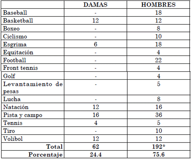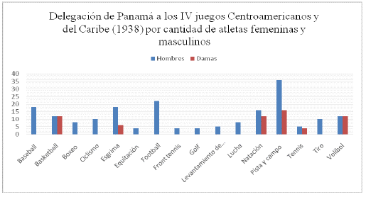 De las 16 disciplinas deportivas en las que participó la delegación de Panamá en los IV juegos Centroamericanos y del Caribe de 1938, las mujeres lo hicieron en 6 y los hombres en todas, como se muestra en la tabla 1. Por eso, por cada atleta femenina (24.4%) que integró el total de la delegación (254) participaron tres hombres (75.6%), pero en dos disciplinas (basketball y volibol) las cantidades fueron idénticas y en tennis fueron 4 mujeres y 5 hombres. Además, la participación de las atletas femeninas en natación (4) fue superior al promedio: 43% mujeres y 57% hombres.