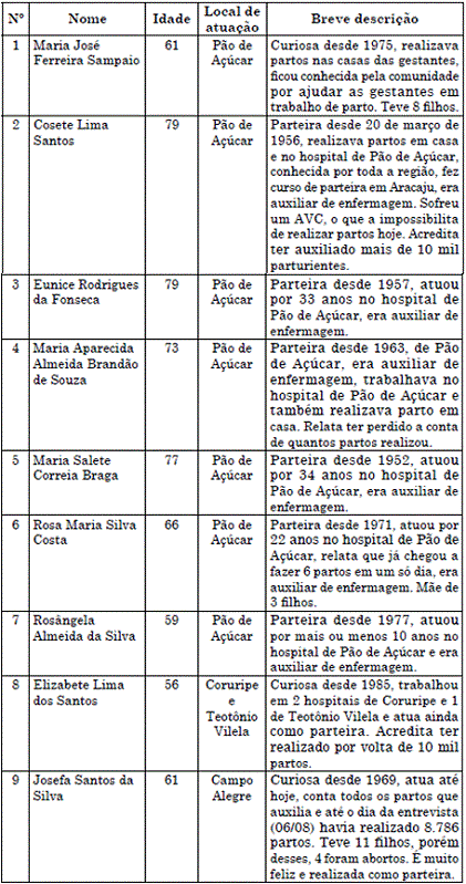 Considerando que o objetivo desta seção é analisar o saber e fazer das parteiras e curiosas em Alagoas que atuaram junto à FSESP, a partir do referencial teórico de Collière, optou-se por apresentar um quadro de apresentação destas mulheres, que são as protagonistas desta história.