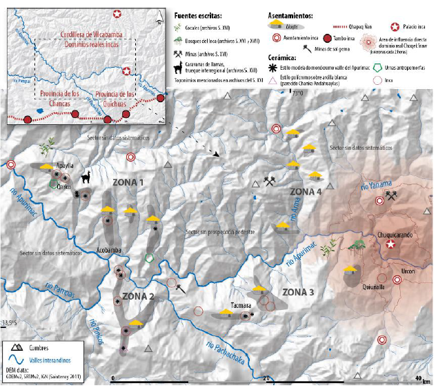 La documentación etnohistórica informa, desde una perspectiva top-bottom , que en tiempos incas el valle medio del Apurímac no formaba un territorio homogéneo, sino un espacio intermedio situado en los confines de las provincias de los Chancas y de los Quichuas y de los dominios reales de Vilcabamba. Estos límites correspondían más o menos a la confluencia de los valles interandinos: Apurímac, Pachachaka y el Pampas (Figura 8). Sin embargo, las fuentes son escasas y entregan escasos detalles sobre la ocupación de un espacio intermedio y a sus dinámicas geopolíticas. Entregamos, a continuación, un panorama de la ocupación del valle en tiempos prehispánicos tardíos, como lo permite vislumbrar la confrontación de los datos arqueológicos y etnohistóricos.