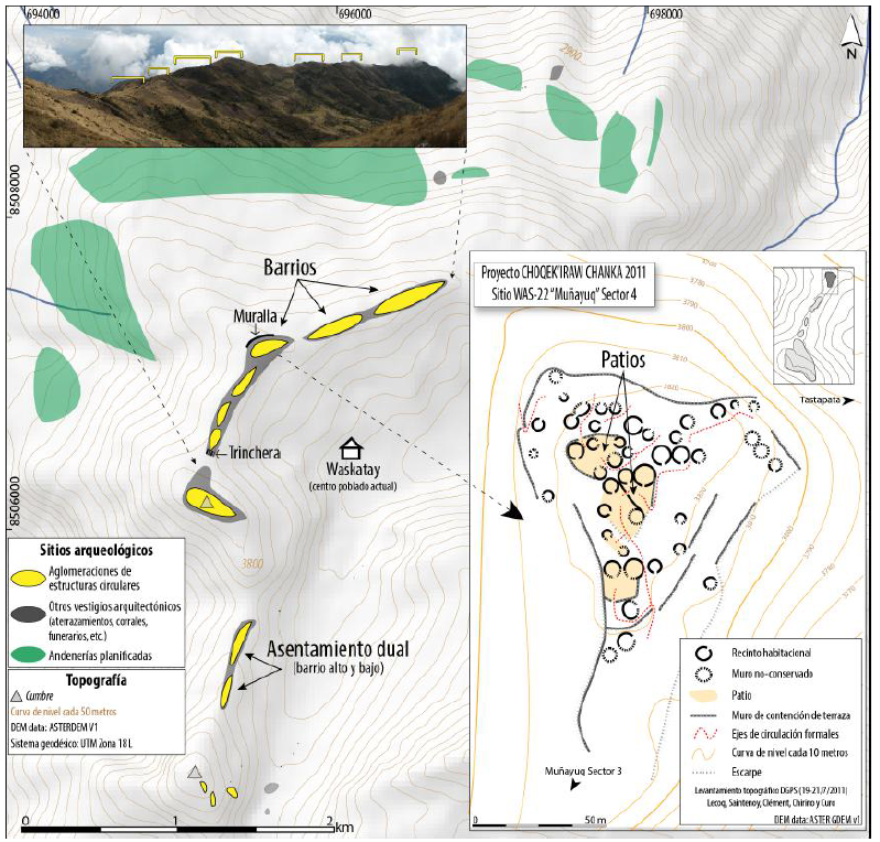 Además de su extensión, los asentamientos habitacionales se distinguen por el grado de planificación del espacio construido. En efecto, varios sitios arqueológicos presentan vestigios de grandes obras de aterrazamiento emprendidas para estructurar el espacio aldeano (y en particular acondicionar áreas propicias para la circulación y las reuniones colectivas). En algunos casos, los asentamientos están estructurados en barrios. Por ejemplo, el mayor complejo residencial de la región, implantado sobre la cresta cimera de las alturas de Waskatay, donde los vestigios habitacionales prehispánicos se extienden sobre 18 ha, está fraccionado en cinco aglomeraciones que forman más barrios, algunos de ellos delimitados por muros y zanjas. Estos acondicionamientos que buscaban controlar el acceso a estos barrios, o por lo menos individualizarlos, constituyen un testimonio material de una segmentación del espacio social a una escala mayor que aquella de la segmentación en grupos domésticos materializada por los conjuntos con patio. Esta división evoca a los “ayllu barrios” documentados en etnografías de pueblos andinos (Abercrombie 2006 [1998]; Rivière 1983). Otro patrón de segmentación del espacio social se observa en los sitios de Toroyuq, Inkawasi y Quchapata, donde parejas de asentamientos –uno arriba, otro abajo– forman un patrón bipartito, manifestación clásica de la estructuración dual de las comunidades andinas y de sus arquitecturas (Moore 1995; Palomino Flores 1971).