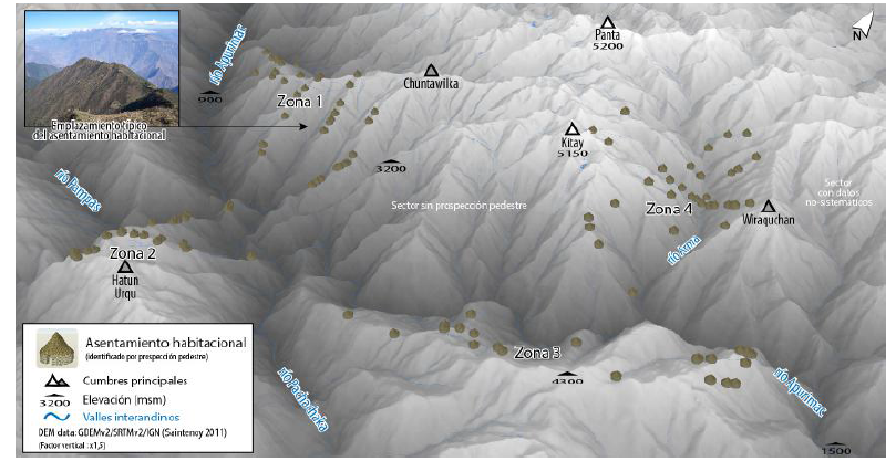 Siendo el valle medio del Apurímac uno de los cañones más profundos de los Andes, sus laderas pronunciadamente inclinadas entre 5.000 y 1.000 msm dejan poco terreno adecuado para el asentamiento (Figura 3). La ocupación prehispánica se concentra sobre los contrafuertes de los cordones montañosos y sobre los espolones de sus laderas 9 (Figura 4). Las crestas constituían el principal medio de vida, donde se encuentran los vestigios de los asentamientos habitacionales junto con los acondicionamientos del medio rural (aun frecuentemente reutilizados): redes viales, infraestructuras hidráulicas (canales y reservorios) y parcelas; aunque la mayoría de las zonas de cultivo se encuentran sobre sistemas de andenes que cubren las laderas de ambos lados de la cresta. Los asentamientos habitacionales que no se localizan en las crestas son generalmente más pequeños y menos estructurados. Se encuentran dispersos sobre las partes altas y bajas de las laderas, así como sobre los promontorios que dominan el fondo de valle.