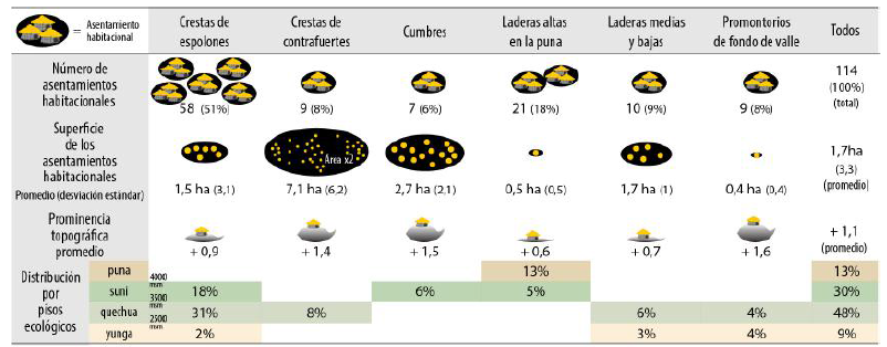 Las prospecciones arqueológicas efectuadas en el valle identificaron los vestigios de 114 asentamientos habitacionales originarios de la época prehispánica tardía. Estos corresponden a aglomeraciones de estructuras habitacionales construidas con piedra (aunque en muchos sitios estas estructuras solo se identifican como simples depresiones en el suelo). La arquitectura de la estructura habitacional es homogénea en el conjunto de la región: es de planta circular y posee una sola abertura y un solo nivel. La calidad de la mampostería depende de las rocas disponibles en el lugar, aunque las estructuras mayores exhiben en general un aparejo más trabajado, como es el caso en otras regiones (DeMarrais 2001; Wernke 2006). Sin duda las disparidades constatadas en lo referente a sus dimensiones (7-50 m2) indican que no todas las estructuras circulares estaban destinadas al mismo tipo de actividades.