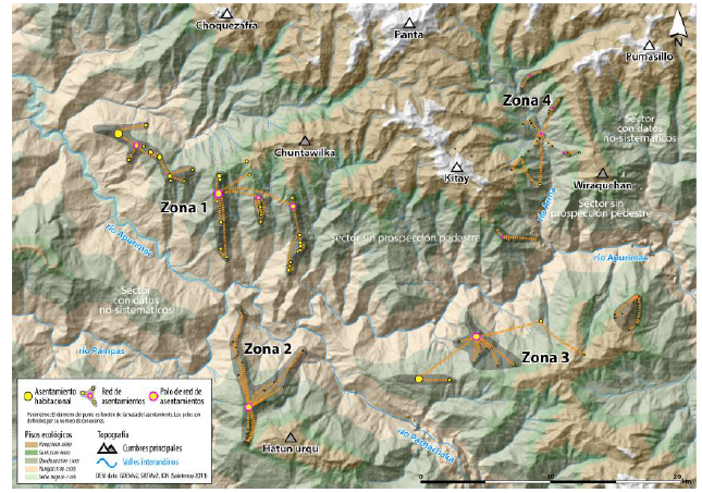 Además de evaluar las potenciales líneas de fuerza estructural de las redes de asentamientos, recurrir a la modelización permite comparar sobre bases cuantitativas la espacialidad del poblamiento de las distintas zonas de interés del área de estudio. El hecho que la sección del Apurímac localizada al pie de la cordillera de Vilcabamba se encuentre en la confluencia de tres de los mayores valles interandinos del sur de los Andes Centrales produce una zonificación geográfica muy marcada, la cual implica un tratamiento por zona del análisis socioespacial del poblamiento.