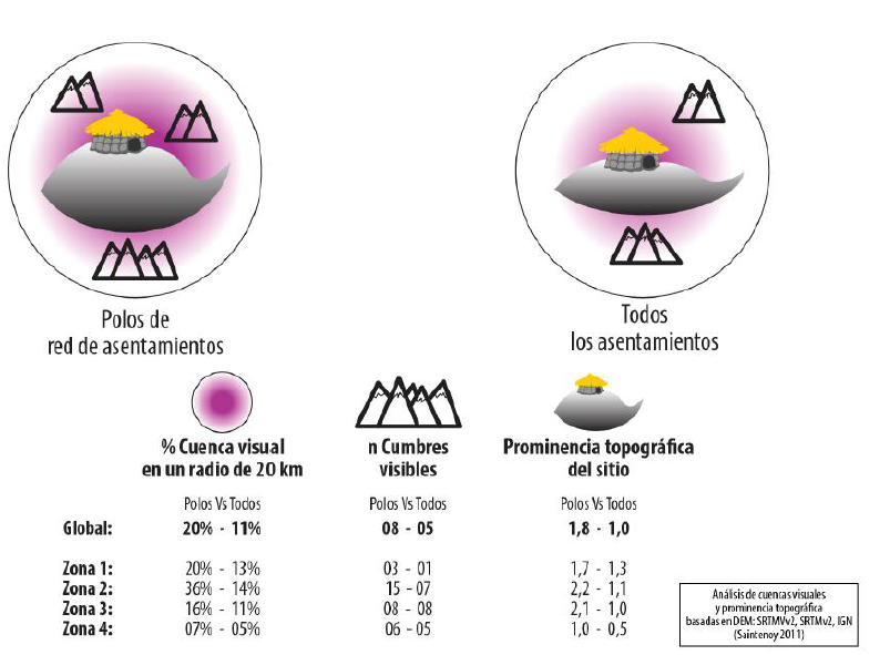 Además de su extensión y arquitectura, los asentamientos principales presentan una pronunciada singularidad locacional, poseen cualidades paisajísticas más desarrolladas que el promedio de los asentamientos (Figura 7), ya que se encuentran sobre lomas y cimas cuya prominencia topográfica forma hitos físicos identificables a lo lejos entre los paisajes serranos. Asimismo, los asentamientos principales fueron implantados en lugares que poseen cierta monumentalidad, la que otorgaba potencialmente a cada comunidad un lugar específico a la vista en el paisaje (según la asimilación del asentamiento a la geoforma del sitio). Por este motivo, este patrón locacional podría entonces haber desempeñado una función territorial. Efectivamente, en ausencia de representación cartográfica del territorio, el paisaje –el entorno natural y construido como es experimentado in visu
