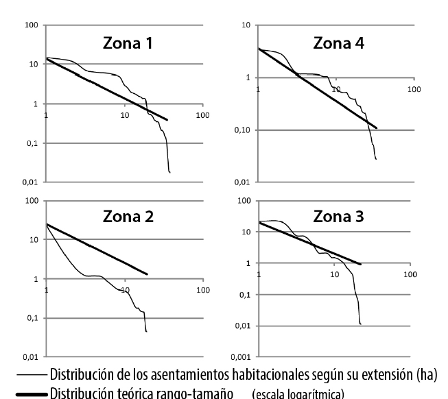 Los resultados brutos de la modelización (Figura 6) ponen en evidencia la heterogeneidad de las redes de asentamientos en la zona de estudio. En la zona 1, el patrón de asentamiento aparece segmentado en redes que corresponden a las principales unidades fisiográficas, al contrario de la zona 2 marcadamente centralizada. En la zona 3 se distingue un polo con redes anexas así como una red marginal en tierras altas. La zona 4 se caracteriza por su desigual patrón de asentamiento, centrado en torno al fondo del valle, y donde además destacan redes segmentadas análogas a las de la zona 1 sobre las laderas.