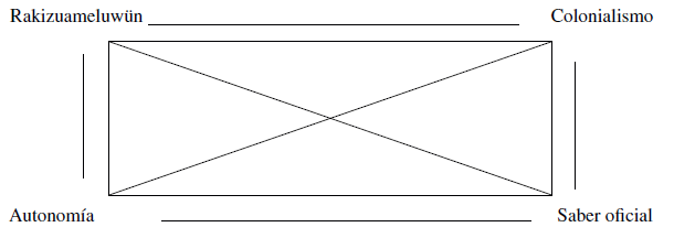 El eje de contradicción Rakizuameluwün- Saber oficial presenta la confrontación entre el pensamiento mapuche y el conocimiento que desde el mundo occidental se ha producido sobre el mapuche. Esta oposición por negación se organiza en función de la necesidad de producir una soberanía epistemológica que permita al sujeto mapuche generar sus propias lógicas de construcción de conocimiento en torno al desciframiento de su mismidad y la crítica al colonialismo desde una perspectiva de la autonomía político-intelectual mapuche, resolviéndose, por efecto, la coherencia del eje de complementariedad Rakizuameluwün- Autonomía . El pensamiento mapuche se posiciona en una dimensión de carácter autonomista dado los procesos de colonización epistémica que imperan al momento de pensar la situación mapuche en su relación con el mundo occidental. Por su parte el eje de contrariedad Rakizuameluwün- Colonialismo refuerza la lógica del eje recientemente descrito, puesto que mediante este se posiciona al pensamiento mapuche como perspectiva políticointelectual descolonizadora. A su vez, este eje adquiere coherencia al comprender que el eje de complementariedad Colonialismo-Saber Oficial es parte constitutiva del fenómeno colonial. El Saber Oficial como práctica colonial se traduce en la utilización del mapuche como mero objeto de estudio y en la desvalorización de su posición epistémica como posibilidad de pensarse a sí mismo. El eje de contrariedad Autonomía-Saber Oficial responde a la urgencia de constituir prácticas epistémicas que se reconozcan parte de un colectivo político, intelectual y cultural que busca desprenderse de la retórica academicista no mapuche, situación que condiciona la coherencia del eje de contradicción Autonomía-Colonialismo , pues este enfatiza en que El esquema relacional que permite configurar el cuadro semiótico, considerando los ejes de Contradicción, Contrariedad y Complementariedad, es el siguiente: El eje de contradicción Rakizuameluwün- Saber oficial presenta la confrontación entre el pensamiento mapuche y el conocimiento que desde el mundo occidental se ha producido sobre el mapuche. Esta oposición por negación se organiza en función de la necesidad de producir una soberanía epistemológica que permita al sujeto mapuche generar sus propias lógicas de construcción de conocimiento en torno al desciframiento de su mismidad y la crítica al colonialismo desde una perspectiva de la autonomía político-intelectual mapuche, resolviéndose, por efecto, la coherencia del eje de complementariedad Rakizuameluwün- Autonomía . El pensamiento mapuche se posiciona en una dimensión de carácter autonomista dado los procesos de colonización epistémica que imperan al momento de pensar la situación mapuche en su relación con el mundo occidental. Por su parte el eje de contrariedad Rakizuameluwün- Colonialismo refuerza la lógica del eje recientemente descrito, puesto que mediante este se posiciona al pensamiento mapuche como perspectiva políticointelectual descolonizadora. A su vez, este eje adquiere coherencia al comprender que el eje de complementariedad Colonialismo-Saber Oficial es parte constitutiva del fenómeno colonial. El Saber Oficial como práctica colonial se traduce en la utilización del mapuche como mero objeto de estudio y en la desvalorización de su posición epistémica como posibilidad de pensarse a sí mismo. El eje de contrariedad Autonomía-Saber Oficial responde a la urgencia de constituir prácticas epistémicas que se reconozcan parte de un colectivo político, intelectual y cultural que busca desprenderse de la retórica academicista no mapuche, situación que condiciona la coherencia del eje de contradicción Autonomía-Colonialismo , pues este enfatiza en que partir de un pensamiento autónomo se tornará posible develar la matriz colonial y programar una agenda de transformación de las condiciones de dominación que el Estado y sus aparatos de control han institucionalizado y normalizado en contra del Pueblo Mapuche.