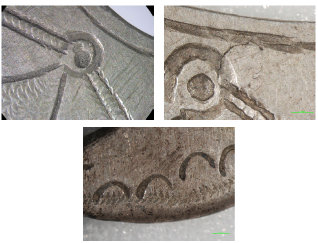 En el caso de los chahuay discoidales, el cuerpo de la joya en los ejemplares simples (grupos 1 y 2) y en los compuestos (grupo 3) es generalmente obtenido martillando un lingote, que es luego recortado para darle la forma discoidal requerida e integrar eventualmente la o las placas de suspensión. Sin embargo, en algunos casos el cuerpo de la joya se obtuvo simplemente por fundición. Aquí, el cuerpo presenta a menudo un borde aserrado por recorte (Figura 5). Sin embargo, la decoración cincelada de estos aros es generalmente de ejecución grosera, en marcado contraste con la habilidad requerida para una metalurgia por fundición, o a la capacidad de darle al cuerpo de la pieza una forma armoniosa por recorte y cincelado. La destreza y la habilidad del artesano (la seguridad de ejecución de su trabajo) son visibles en el resultado de los golpes de cincel o de punzón aplicados para producir el motivo decorativo. Aquí las marcas de cinceles o punzones son burdas y poco regulares, realizadas con poca fuerza y firmeza, a veces con errores en la ejecución de los motivos, sugiriendo una mano inexperta, con poca costumbre de este tipo de trabajo (Figura 11). La irregularidad de la decoración de ciertos aros comparada con el trabajo homogéneo y regular de otros lleva a pensar que ciertas joyas fueron decoradas por un orfebre profesional (platero) y otras por personas que, aunque posiblemente controlaran el proceso metalúrgico, no tenían experiencia en la ejecución del grabado y del cincelado.
