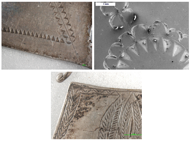 El conjunto de joyas homogéneo y proveniente de una misma toldería sugiere varias interrogantes. En primer lugar el saber si esta homogeneidad en la tipología se observa también en la tecnología y en la materia prima empleadas, así como en la calidad de ejecución de las piezas. El análisis preliminar de los aros de la colección realizados por microscopia óptica, SEM y radiografía (Guerra 2008) muestra que las piezas fueron producidas principalmente por fundición y por martillado, recorte, perforación y pulido. Los motivos decorativos, generalmente en cincelado, corresponden a una simple sucesión de marcas realizadas por golpe con una pequeña variedad de cinceles y punzones de formas simples y variadas.