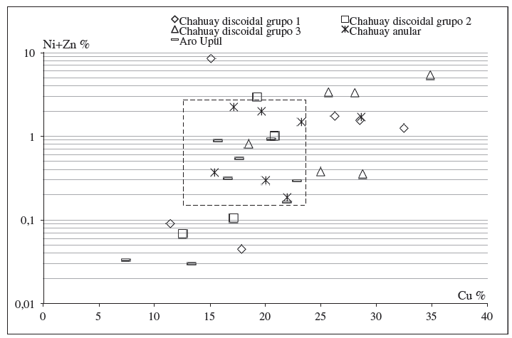 La Figura 14 presenta el tenor en níquel y zinc en función del tenor en cobre de las piezas analizadas. Se observa que la mitad de las piezas contiene pequeñas cantidades de níquel y zinc. Aun así, el tenor en zinc en los aros upül es siempre inferior a 1%, lo cual indica que no fueron empleadas en su confección aleaciones de Cu-Zn-Ni. En los otros dos tipos de aros, los aros discoidales y anulares, la ausencia y presencia de esas aleaciones se observa en proporciones equivalentes, sugiriendo un uso indiscriminado de la masa metálica a disposición. Se observa también que los upül y los aros anulares se encuentran casi todos concentrados en un solo grupo químico.