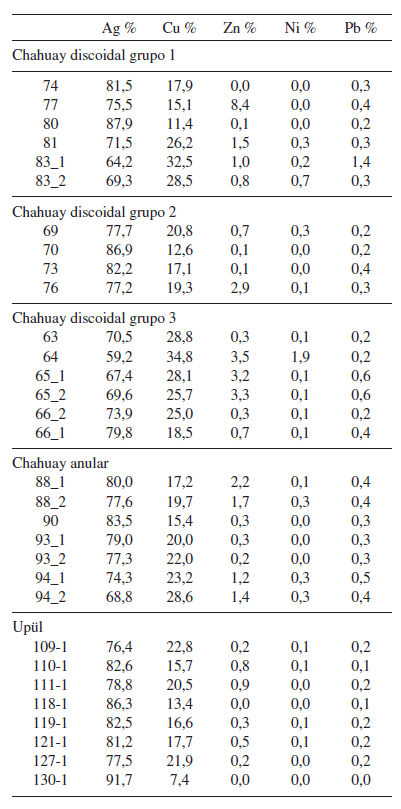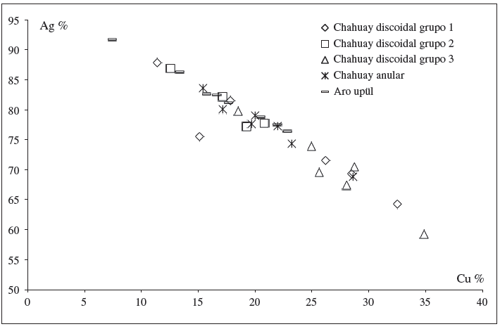 Los análisis de composición fueron realizados por PIXE (del inglés particle induced X-ray emission) con un haz de protones de 3 MeV y 50 μm de diámetro (Guerra 2011; Guerra y Tissot 2013) en el acelerador AGLAE del Centre de Recherche et de Restauration des Musées de France, en Paris. Los resultados muestran que las piezas se produjeron en aleaciones de plata de calidad variable, constituidas de diferentes elementos. La Tabla 1 presenta los resultados obtenidos para los tres tipos de aros; en lo que se refiere a los chahuay discoidales compuestos solo se consideró el cuerpo del aro (sin las placas ni los anillos de suspensión). En la Figura 13 se representan las concentraciones de plata y cobre obtenidas para los aros por tipo. Lo que resalta a primera vista es que los aros upül son los únicos que presentan una aleación de mejor calidad y más constante, con un alto porcentaje de plata contenido entre 76 y 92%. Los dos otros tipos de aros tienen un tenor en plata por lo general inferior, en una gama entre 59 y 88% en el caso de los aros discoidales, y 74 y 84% en el de los aros anulares.
