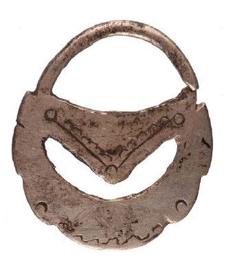 Los aros o chahuay de forma discoidal (Figuras 5 a 7), los “más comunes entre los Mapuche” (Claude Joseph 1928), eran “de uso cotidiano y permanente” (Morris von Bennevitz 1997:74). Estas joyas estaban vinculadas a su propietaria, presentando en sus calados y decoración hechos relacionados con ella, o con su vida, dejando suponer que los aros podían evolucionar en su forma o decoración, o bien ser reemplazados, a lo largo de la vida de la mujer. Entre los tehuelches, también se emplean estos “aros sencillos […] más chicos, redondos” (Priegue 2007:76). En la colección La Vaulx, que cuenta con cinco pares y 21 aros sueltos, se pueden distinguir tres grupos de aros dentro de este tipo: (1) los más pequeños, sin calado y con una limitada decoración (Figura 5), que miden entre 2,2 y 2,7 cm de alto; (2) aquellos más grandes con calado y decoración (Figura 6), de dimensiones comprendidas entre 2,6 y 3,8 cm; (3) los mayores, con uno o dos calados, decoración, y una a tres placas circulares o romboidales unidas al cuerpo de la joya por anillos metálicos (Figura 7), que miden de 3 a 6,3 cm. Hemos analizado seis de los primeros (un par y cuatro sueltos), cuatro de los segundos (sueltos) y cuatro de los terceros (un par y dos sueltos).