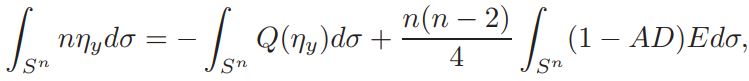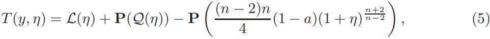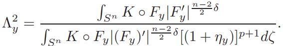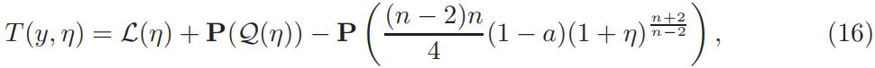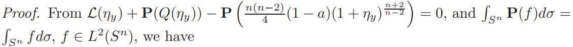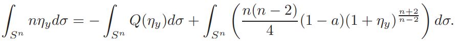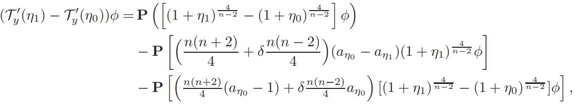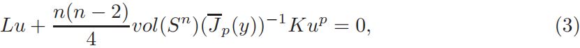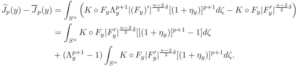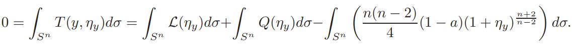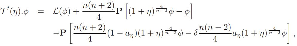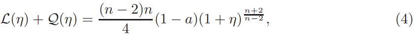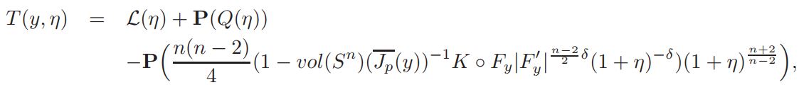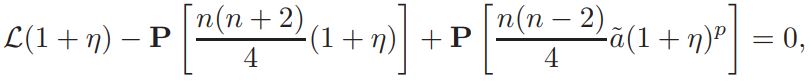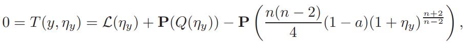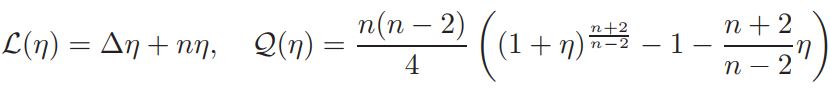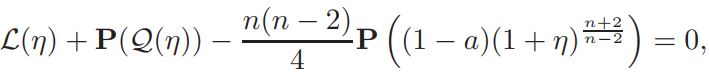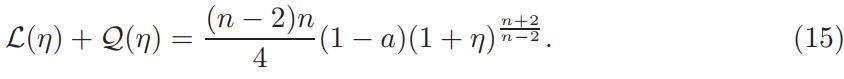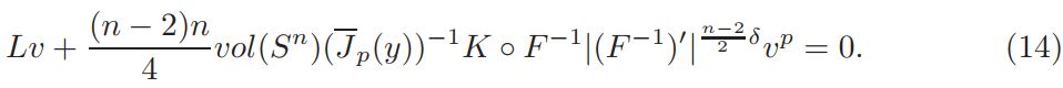 Setting v = 1+ η, and defining L(η)=∆η + nη, Q(η) = n(n−2)/4 ((1 + η) n+2/n−2 − 1 − n+2/n−2 η), and a = vol(Sn)(Jp(y))−1K ◦ F−1|(F−1)′ | n−2/2 δ(1 + η)−δ, if v is a solution of equation (14), then η is a solution of problem