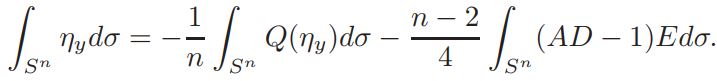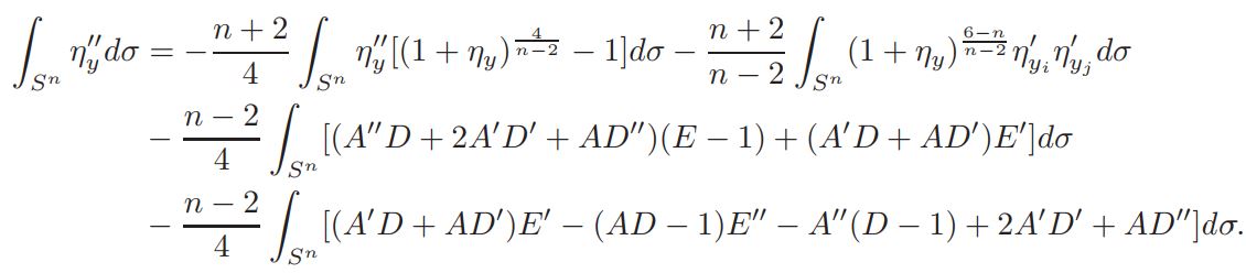 Let F : Sn → Sn be a conformal transformation and v = αF (u) : |(F −1)′ | n−2/2 u ◦ F −1. A straightforward calculation shows that u is solution of (3) if and only if the function η = v − 1 is a solution of an equation of the form
