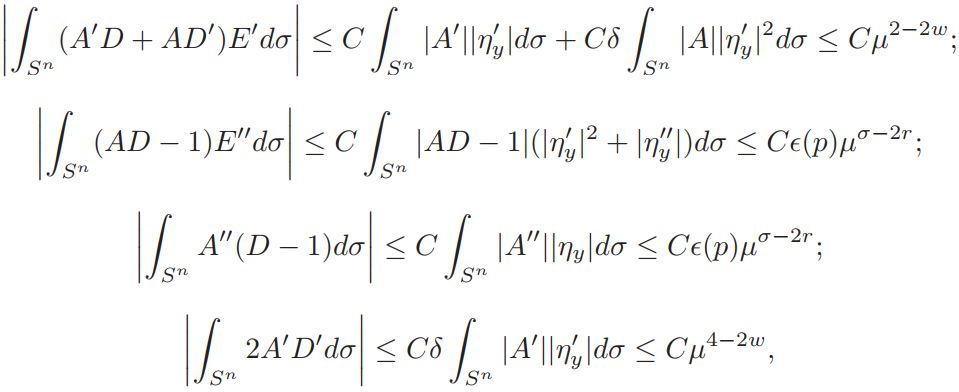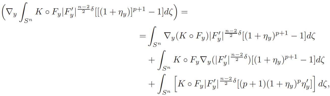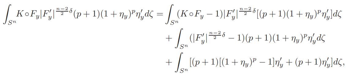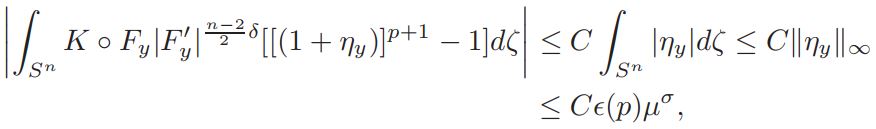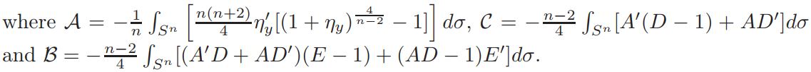 Setting A = Vol(Sn)Jp−1 (y)K ◦ Fy|F′y| n−2/2 δ, D = (1 + ηy)−δ and E = (1 + ηy) n+2/n−2 , we get