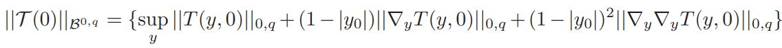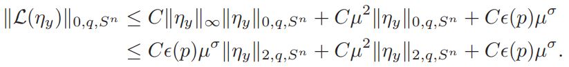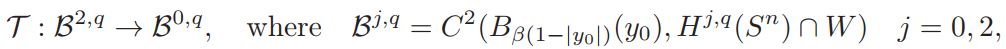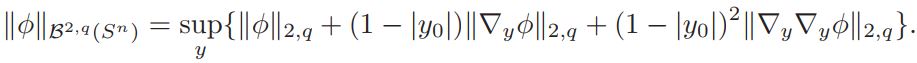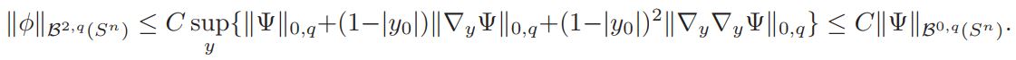 where a0 = vol(Sn)(Jp(y))−1K ◦ Fy|F′y| n−2/2 δ. Since q > n/2 , from the Sobolev embedding Theorem we get ||φ||L∞ ≤ C||φ||2,q ≤ C||φ||B2,q ≤ C. Therefore |L(φ)| ≤ C.