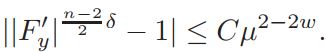 Claim 1. ||F′y| n−2/2 δ −1| ≤ Cµ2−2w, with 0 < w < 1 and y ∈ Bβ(1−|y0|)(y0).