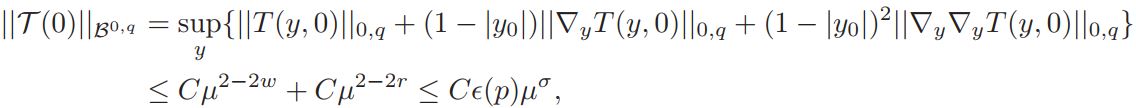 Moreover, ||(T′ (0))−1|| ≤ C, where the constant C is independent on p. There exists η ∈ B2,q with ||η|| ≤ Cǫ(p)µσ and T (η)=0. Furthermore η is the unique small solution of T (η)=0.
