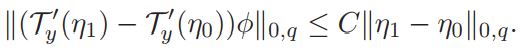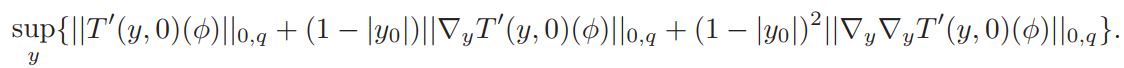 From this inequality and the estimates of Lemma 3.2, we obtain |T ′ (y, 0)(φ)| ≤ C, and ||T ′ (y, 0)(φ)||0,q ≤ C. Working similarly, and using the fact that φ, ∇yφ, ∇y∇yφ belong to H2,q(Sn) for q > n/2, we get ||T′ (0)|| ≤ C.