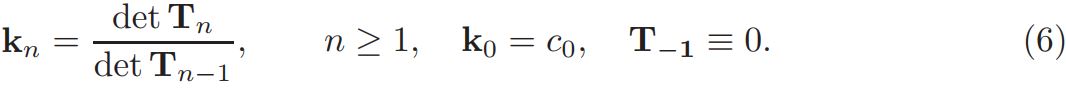 where kn ≠ 0, holds for every n, m ≽ 0. Notice that the sequence {φn}n≥0 can be obtained by using the Gram-Schmidt orthogonalization process with respect to the basis {zn}n ≽ 0. The necessary and sufficient conditions for the existence of such a sequence can be expressed in terms of the Toeplitz matrix T: {φn}n≥0 satisfies the orthogonality condition if and only if Tn, the (n + 1) × (n + 1) principal leading submatrix of T, is non-singular for every n ≥ 0. In such a case, L is said to be quasi-definite (or regular). On the other hand, if det Tn > 0 for every n ≥ 0, then L is said to be positive definite and it has the integral representation