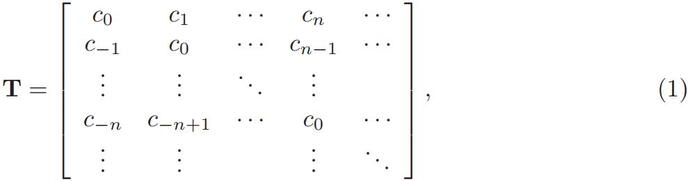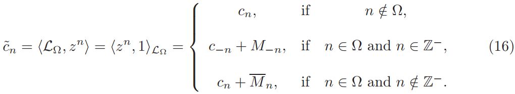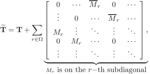 In other words, LΩ represents an additive perturbation of the moments cr and c−r of L, with r ∈ Ω. The rest of the moments remain unchanged. This is, the Toeplitz matrix associated with LΩ is