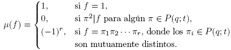 Demostración. Sean a, b ∈ M(q; T ), y escribamos a = p1α1 · · · prαr y b = q1β1 · · · qsβs tales que pi, qj ∈ P(q;T ). Si (a, b) = 1, entonces los pi son distintos de los qj . Si algunos de los αi o de los βj es mayor que 1, entonces a o b tiene algún divisor cuadrado que también lo será de ab. Por lo tanto, μ(ab) = 0 = μ(a)μ(b). Por el contrario, si α1 = · · · = αr = β1 = · · · = βs = 1, entonces μ(a) = (−1)r, μ(b) = (−1)s y μ(ab) = μ(p1α1 · · · prαrq1β1 · · · qsβs) = (−1)r+s. Por lo tanto, μ(ab) = μ(a)μ(b).